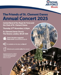 The Chair and Trustees are delighted to announce that the Central Band of the RAF will play at the concert, together with the wonderful Choir of St Clement Danes. We are in for another splendid evening of excellent music.